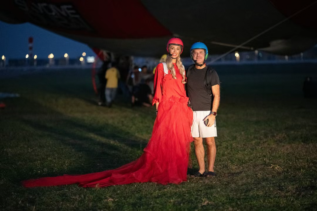 玛加利亲自设计了引人注目的红色连衣裙,并与跳伞伙伴Ludovic Lang将其打造出来,既保证了惊艳的视觉效果,又符合空气动力学。