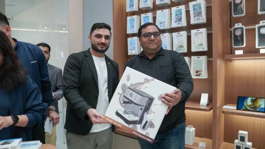 除此之外,在Dubai Mall 荣耀旗舰店还能体验到首次来到中东地区的一系列新奇的AI生态产品,包括智能吉他,智能钢琴键盘,智能空气鼓,音乐旅行头枕,以及荣耀香水耳机等产品