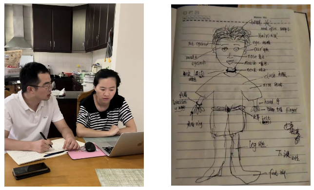 (左)雷雷辅导不凡学英语,(右)不凡学英语的笔记