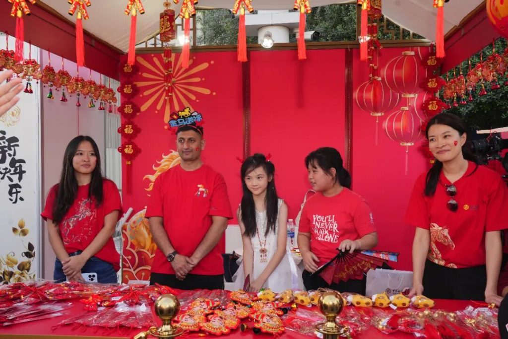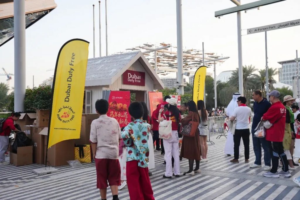 此外,【银联Union Pay】特意安置了一块极具中国特色的的打卡地,让很多小伙伴拍照打卡,还有精美的礼包,冰箱贴,免费赠送给热情参展的同胞们,【迪拜免税店】将酒类产品的九折二维码放在店外,并为往来的群众送上免费的巧克力和精美的护照套;【BA面包】则将新鲜出炉、冒着热气的面包陈列在恒温保温箱中供人选购……还有众多商亭向游人赠送中国结、红包、福字和对联,让巡游结束后的集市仍保持了一下午的热潮。
