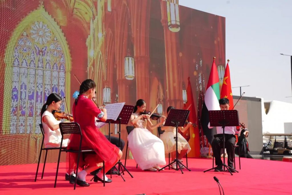 时至14:20,位于中国馆前的舞台上,迪拜星海弦乐团以一曲激昂的小提琴版《赛马》将马年的气氛点燃,随后的潮汕英歌舞、舞蹈《茉莉花开》和《舞动中国》以及当下极为热门的机器人舞先后在舞台上呈现,不仅带给了在座观众极致的视听享受,也让场外路过的华侨华人和老外们纷纷驻足观看,掌声此起彼伏。