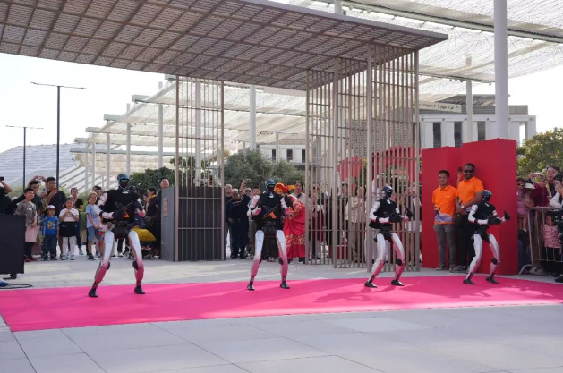 再接下来是打着“阿联酋粤商会”和“捷英英歌队”仪仗旗的方阵,脸上画着油彩脸谱、身着表演服装的众人一边表演一边前行,表演大开大合,充满张力;然后,由人形机器人和机器狗引导的“中国科技方队”紧随其后,两个“硅基生物”在热烈的人群中走得泰然自若、如入无人之境。