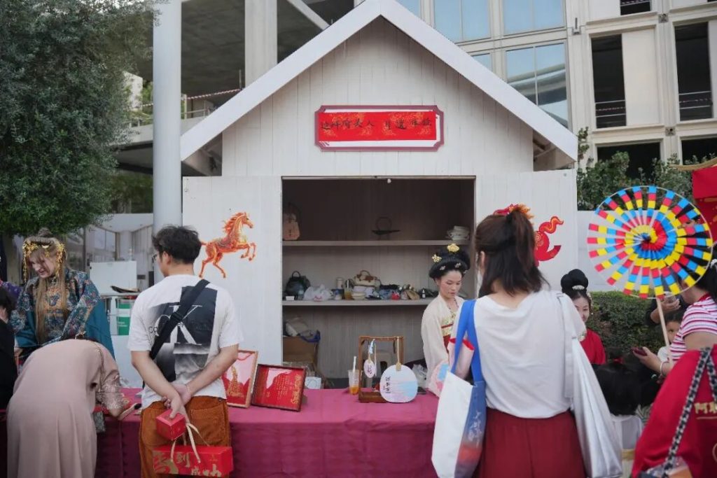 时至下午,人流逐渐增加,国风的汉服与优雅的旗袍以及色彩明艳的民族服饰在人潮中渐渐显现,没错,这就是国风集市和春节活动的魅力,那些传统的、民族的服装你可以自信地穿出门,在这个场合中与当地人的白袍、现代的休闲服同框也毫不违和,加上卖糖人、卖春联、写福字、写许愿牌的摊位,以及穿梭其中的身穿戏曲服装的人物一招一式的表演,让整个集市充满了传统“庙会”的热闹氛围。