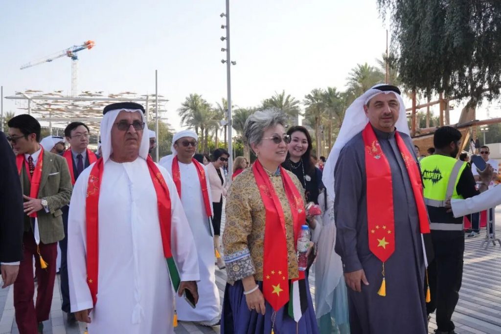 随后,中国驻迪拜总领事欧渤芊、中国驻阿联酋使馆临时代办赵亮和中阿重要嘉宾走过人群,与两边的民众热情问候,激昂的铜锣声和活跃的舞狮紧随其后;不少小朋友骑在爸爸的肩上开心而兴奋地叫着。