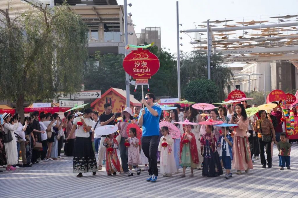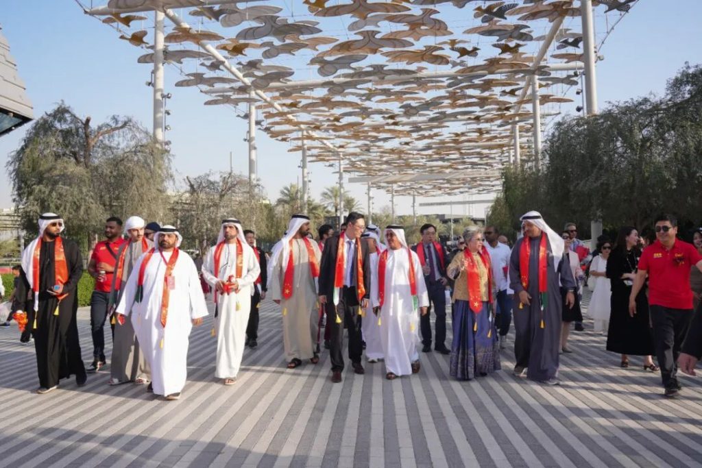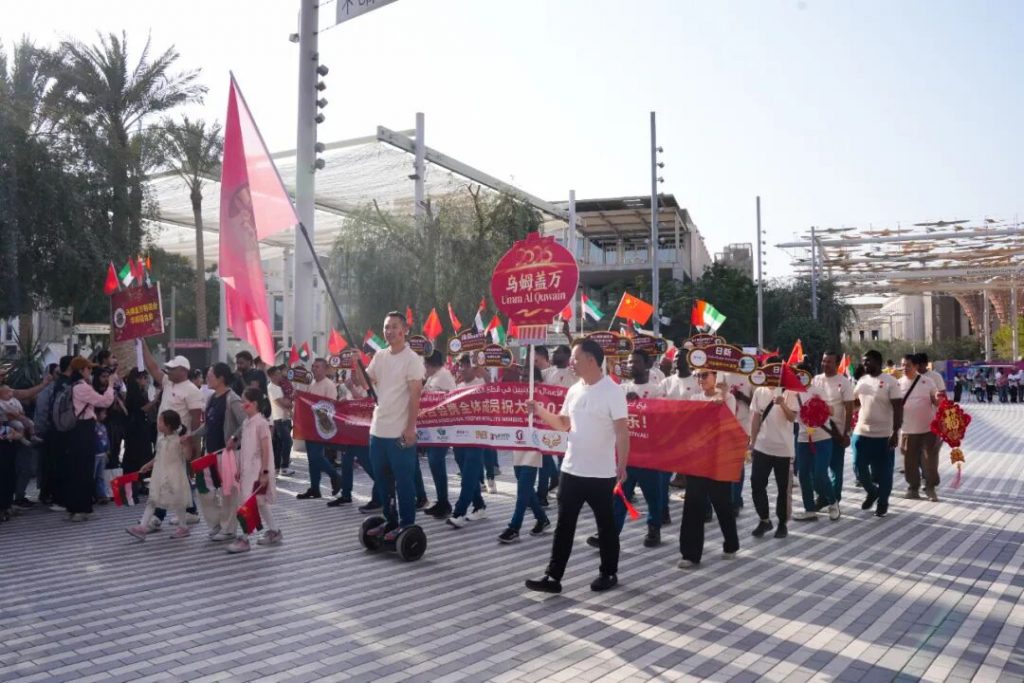 开幕式结束后,盛大的大巡游正式开始,以中国馆为起点,经过埃及馆和沙特馆前,浩浩荡荡,人头攒动。队伍以鲜衣怒马、威风凛凛的阿联酋骑警打头阵,紧接着是个位数车牌的宾利和特斯拉警车以及阿联酋的鼓号队,气势雄壮、乐声激昂,可谓排面拉满,道路两侧民众的欢乐情绪被瞬间点燃,纷纷掏出手机拍照或是录像,听取“哇”声一片。