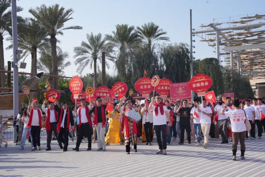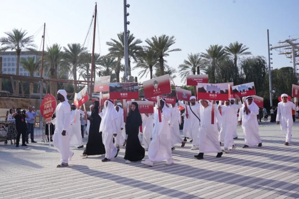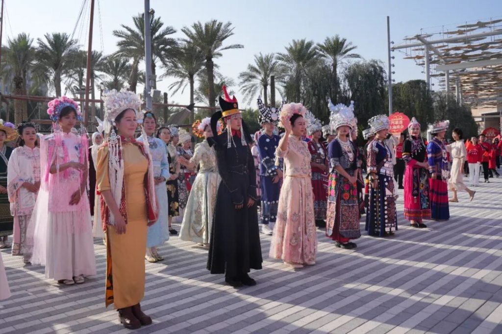 随后就是中国各省的商会的方阵,伴着《爱我中华》的旋律,手举“中阿友谊长存”的牌子,挥舞中阿国旗;紧接着是一波各族服饰的集中呈现,辨识度最高的是苗族的银饰、满族的旗头,一时间罗绮如云、环佩叮当……