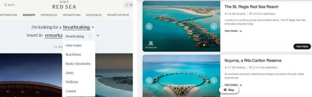 - Ummahat岛:汇聚了两大顶级度假村 —— 红海瑞吉度假村(The St. Regis Red Sea Resort)与努朱玛丽思卡尔顿隐世精品酒店(Nujuma, a Ritz-Carlton Reserve)。隈研吾设计的瑞吉超有格调,而卡尔顿隐世每晚房价约3,431美元,堪称中东最贵……