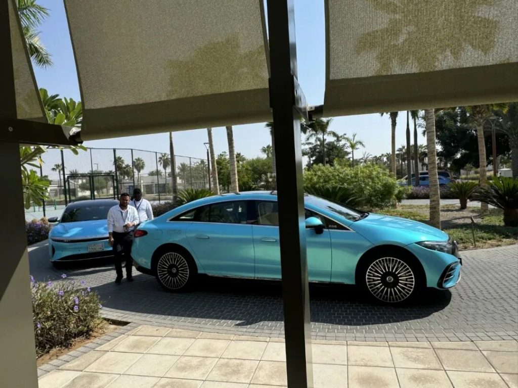 根据所在岛和所在酒店的不同,从红海机场到每家酒店的接驳交通和所用时长有所不同。瑞吉酒店这边,先乘坐统一色系的奔驰或者Lucid汽车,开25分钟到海边,然后再坐40-50分钟酒店接驳船,最后才能到达酒店。接驳车是一个房间一辆车,接驳船是同一酒店客人共享的,全程服务到位。