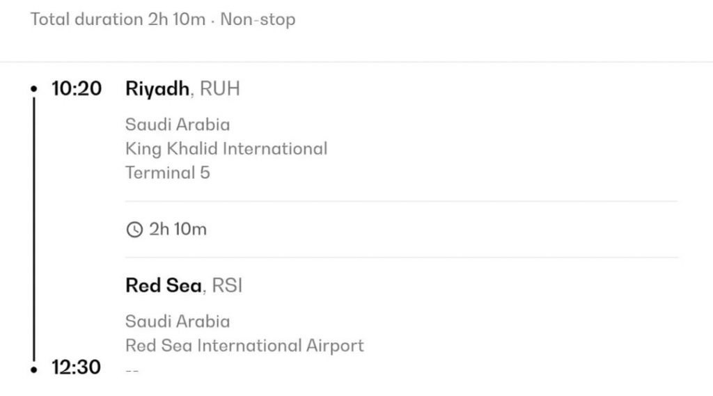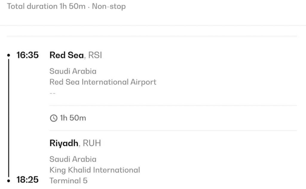 飞往沙特阿拉伯红海地区,需要预订目的地为红海国际机场(RSI)的航班。目前有沙特航空、Flynas航空和迪拜航空等运营商提供从利雅得(RUH)、吉达(JED)出发的沙特国内航线,和从迪拜出发的国际航班。身居中东,只需要一个周末,即可实现从沙漠到大海的地貌大迁徙。具体往返时间如下。