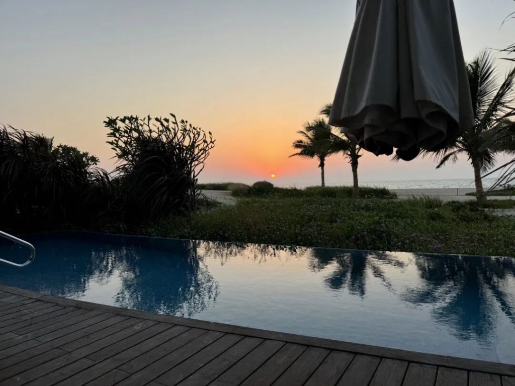 在利雅得常住的那些日积月累的干燥,被这里的海与水一下子补足了,畅饮生命之源。除此之外还可以畅饮的 —— 是阿拉伯咖啡。入住当天,酒店工作人员就特意来到房间给我们提供现做的阿拉伯咖啡和当地的椰枣,仪式感满满。当然,酒店的服务之好不止在这些小细节中,也有贴心的大方。看我们是三个人入住,第二天就给我们换了双卧室的泳池海景房,让把卧室让给长辈的我也拥有了属于自己的卧室,实在感谢。