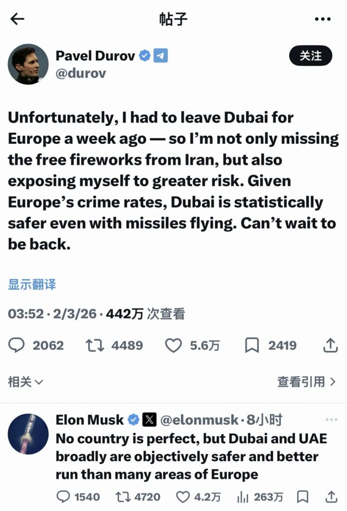 Telegram创始人帕维尔·杜罗夫(Pavel Durov)于3月1日在X(原Twitter)上发帖表示,(及时当前局势下)迪拜仍旧要比欧洲安全得多,原文如下——