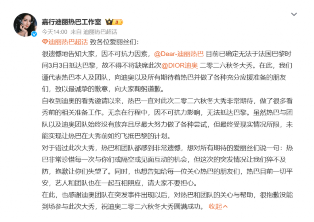 很遗憾地告知大家,因不可抗力因素,迪丽热巴目前已确定无法于法国巴黎时间3月3日抵达巴黎,故不得不将缺席此次@DIOR迪奥 二零二六秋冬大秀。在此,我们谨代表热巴本人及团队,向迪奥以及所有期待着热巴并做了各种充分应援准备的朋友们,致以最诚挚的歉意,向大家鞠躬道歉。