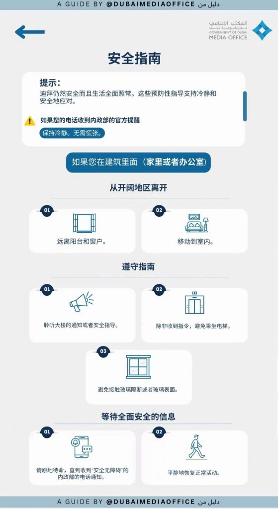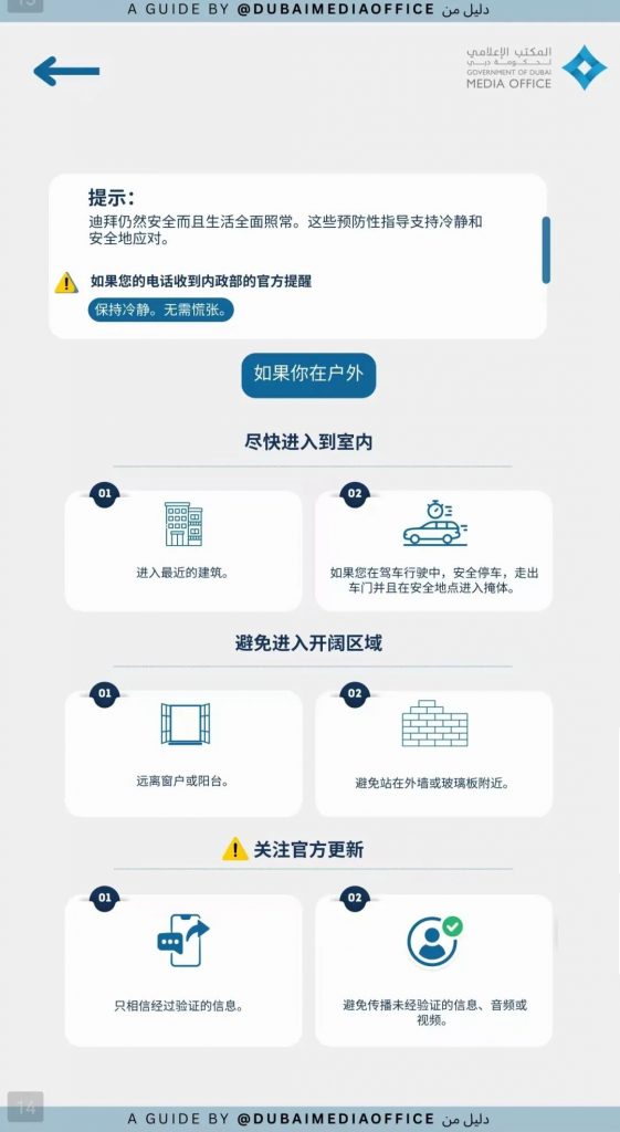 3月17日,迪拜政府媒体办公室与阿联酋国家紧急事务管理署(NCEMA)、迪拜应急中心联合发布《安全指南》,包含应急避险关键信息,并提供阿拉伯语、中文、英语等多语言版本。现转发该指南(中文内容见第13、14页),供大家参考。