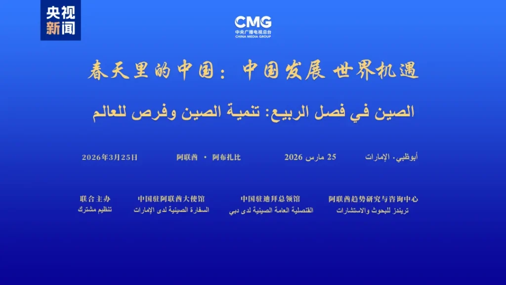 当地时间3月25日,由中国中央广播电视总台、中国驻阿联酋大使馆、中国驻迪拜总领馆、阿联酋趋势研究与咨询中心联合主办的“春天里的中国:中国发展 世界机遇”全球对话会阿联酋专场在阿布扎比举行。中宣部副部长、中央广播电视总台台长慎海雄作视频致辞。中国驻阿联酋大使曾继新、中国驻迪拜总领事欧渤芊、阿联酋趋势研究与咨询中心主席穆罕默德·阿里出席活动并致辞。中阿两国工商界、学界、媒体界等50余名嘉宾参加活动。
