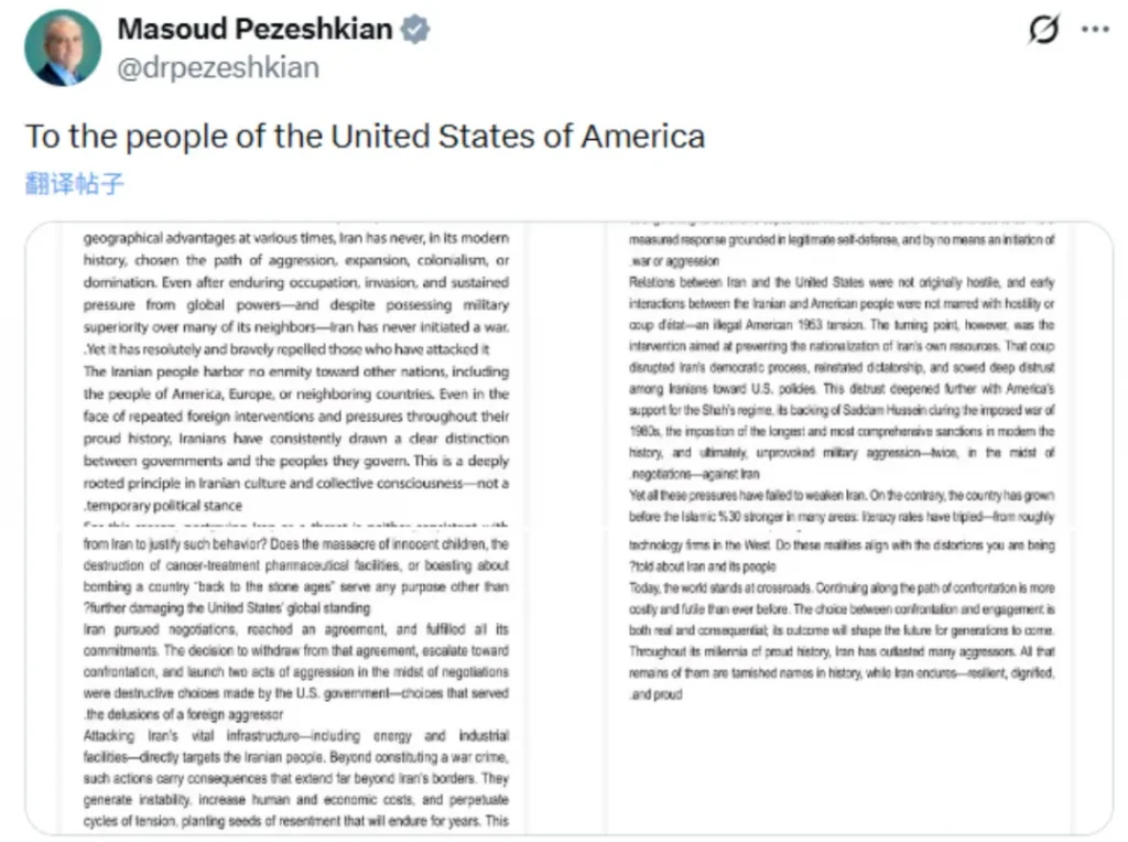 伊朗总统佩泽希齐扬4月1日发表致美国人民的公开信。信中说,伊朗人民对其他国家没有敌意,包括美洲、欧洲或邻国人民。制裁、战争和侵略对伊朗人民生活的破坏性绝不能低估,攻击伊朗的重要基础设施——包括能源和工业设施,构成战争罪。