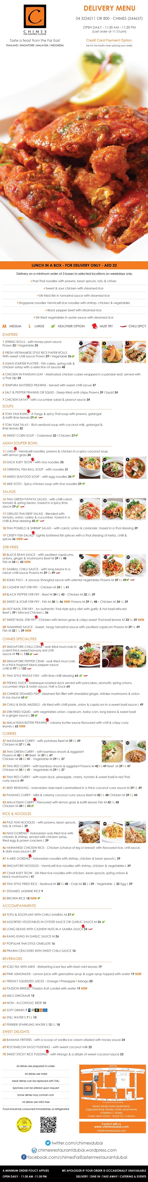 Al Barsha的Chimes餐厅为追求美味的顾客提供东方风味菜肴,我们的团队致力于为顾客提供最优质的食物。在Chimes,所有菜肴都是经过长久的提炼和研究而制成。从2008年起,我们就提供外送和堂食服务,丰富的餐饮业经验使我们拥有强大的竞争优势,在服务顾客的过程中,兼顾技巧和风格。我们坚信只有使用精挑细选的原料,结合用心,才能保证严格的品质。Chimes不断改进和提高独有的菜肴,同时尝试和修正配方及烹饪方式,以最大的新鲜度体现最真实的东方美味。