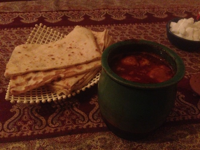 这是Teahouse的主打菜,我忘了菜名了。但它出现在菜单的头条上,所以还是重点推荐一下。菜的重点在于用瓦罐炖出来的鸡汤。里面除了鸡肉之外还有豇豆、西红柿、香料等种种东西,总之相当美味。再配上伊朗传统大饼,那就不但解馋、而且解饿了。在这里饱餐一顿的价格大约是200000里亚尔。