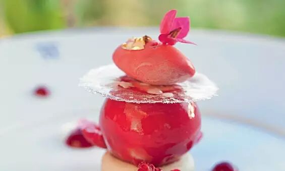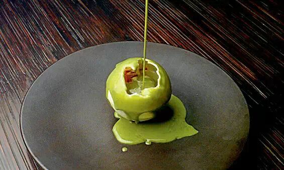 Karma Kafé 这道特制甜点将为你的晚餐增添些许趣味的戏剧性。这道甜点首先是一个空心的白巧克力球,然后侍者将温抹茶浆缓缓地浇在巧克力外壳上,随后一部分外壳慢慢融化,抹茶与巧克力壳内的树莓蛋糕相遇,口感如何呢?快去尝一尝吧。