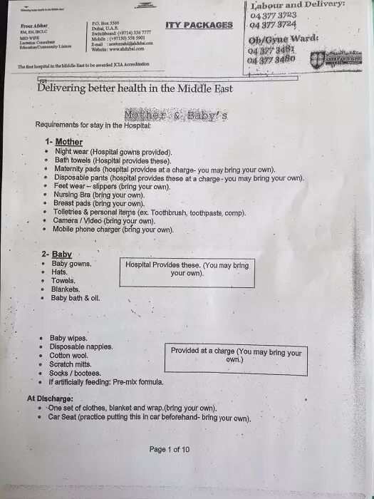 到了Latifa医院,首先了解到的是费用。其分为两部分,一是整个孕期产检套餐费用5000左右,二是生产费用。顺产7000,剖腹10000(四人间,单间的费用还要另算,大概12000,以上价格都是大概,因为时间比较久了所以我记得不太清了)。重要的是,常住迪拜的孕妇需要先办理健康卡,需要用到的证件有:护照原件、签证、ID、结婚证公证认证书、住房合同,水电费缴费单。证件齐全的话,健康卡半个小时左右就能办好,费用大概250(这个健康卡以后还可以用去公立医院看病,每次问诊费150,比起去私立医院没有医疗保险的情况下的问诊费便宜很多),拿到健康卡后,就可以去医院安排的分区诊所注册预约医生安排产检了。