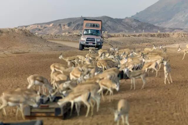 这里曾经是阿联酋前总统的私人岛屿。他和他的家人将这里作为度假的行宫,至今岛上的宫殿仍是接待贵宾的要地。偌大的岛屿自由栖息着世界各地的珍稀动物,长颈鹿、火烈鸟、大羚羊、海豚和海龟等。后来这片神秘的禁地终于向公众开放。为了保护岛上的自然生态,登岛必须先通过预定,而且岛上禁行私家车,野外活动都得按着规矩来。