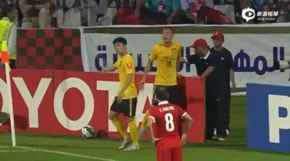 比赛刚开始不久,恒大就在一次进攻中遭遇了令人啼笑皆非的一幕。埃尔克森禁区外倒钩被对方后卫解围出底线,恒大获得角球,黄博文准备主罚角球,但由于场边的广告牌摆放位置太靠近底线,导致黄博文助跑距离不够。小黄随即向场边工作人员示意,要求对方将广告牌的位置稍稍往后挪动。而工作人员只是象征性的向后挪动了一点点,但依然不足以保证黄博文有足够的距离助跑。