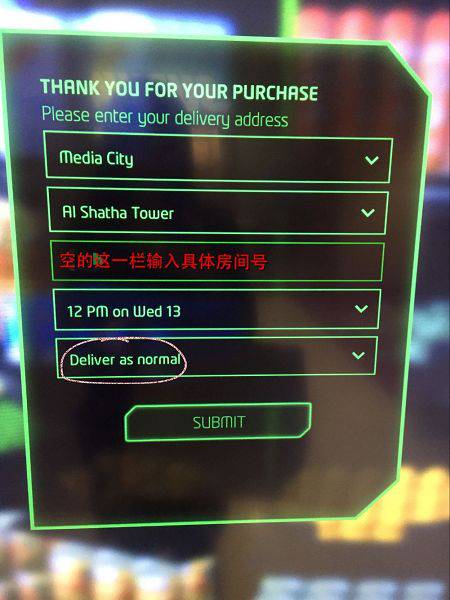 ❽同时,购物屏幕进入以下页面,输入送货详细地址(下图空的那一栏输入具体送货房间号码)、送货时间(10:am-10:pm)及送货方式(按门铃、无需按铃直接将货物放在门外、正常送货)。以上送货细节,可根据自己的需要进行选择。点击“SUBMIT”,提交信息。