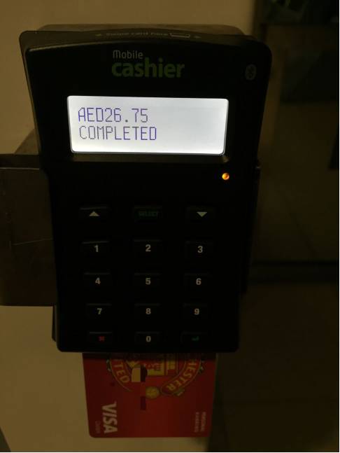 ❼接受订单后,立即插入可付款的银行卡(未提醒银行卡所属限制),输入密码后再次确认付款(可选择在刷卡机上方刷卡,也可选择下方插卡方式)。付款成功后,会显示有“COMPLETED”的字样。