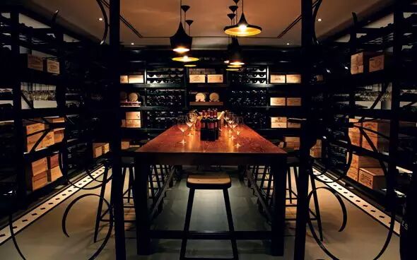 在地下一层你可以找到一个带长墙台的舒服酒窖。这里是适合聚会的很好地方,墙壁四周都是铁货架,上面放着乡村风味的木箱和一层有一层的葡萄酒瓶。在这底下,让你感觉是在法国的一个酒庄小镇,而不是在迪拜的金融中心。