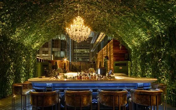 在VII酒吧,内部和外部充分融合。这个Conrad酒店里的屋顶酒吧被叶状的天蓬遮盖,中间悬挂一顶水晶吊灯。酒吧的一段是一整面有华丽镜面点缀的植物墙。
