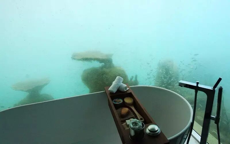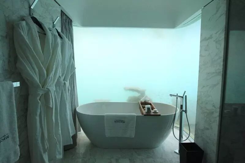 卧室的洗手间也被海洋世界包围,你可以在洗澡的同时和鱼群共舞。