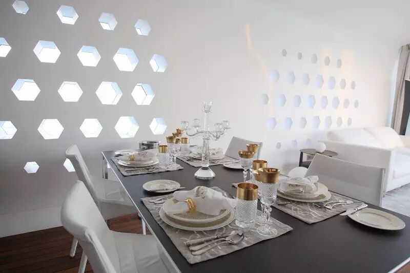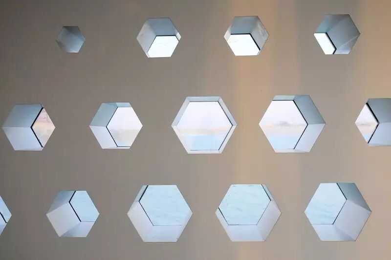 整体白色系设计为基调,大范围落地玻璃的采光使得一楼的客厅很是明亮通透,无论坐在哪个位置都能是面朝大海。墙上六边形窗的设计不仅增加采光空间,也使得屋内可以看到屋外景色,而外面无法看到内部,保护其隐私性。