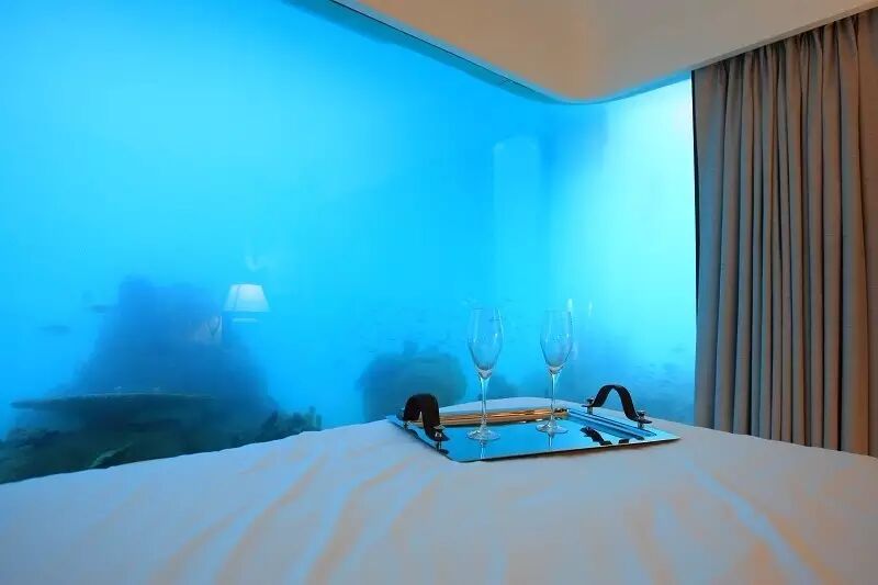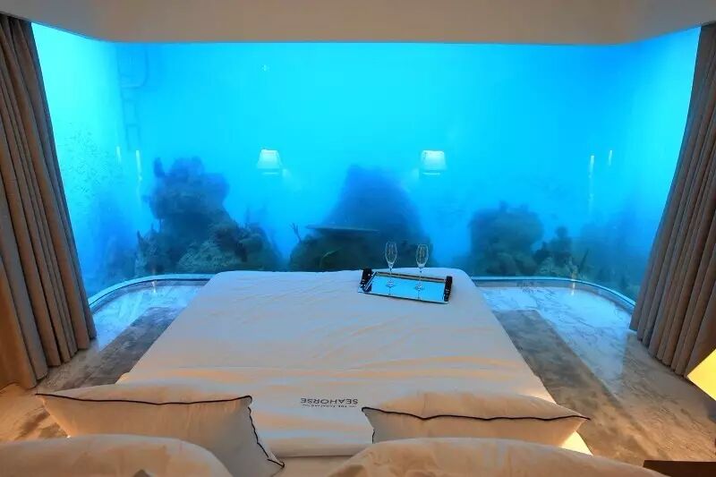 整个”漂浮海马”最精妙和特殊的部分,自然要数沉于水下的海底卧室,不是改造水族箱的模拟海底,而是真正的海底世界。整个卧室呈现一片迷幻的蓝色,可以看到野生的鱼群在珊瑚群周围自由涌动。就好像陆上别墅可以设计庭院景观,”漂浮海马”也可以设计个性化的海底景观,比如你可以选择投放的观赏鱼种类,珊瑚的品种和颜色,或放入其他海洋生物,并由海洋专家为你落实呈现一个符合你喜好的”海底后花园”。