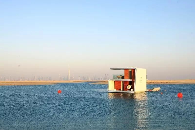 步行约5分钟,便能看到主角 — 坐落于海中央的”漂浮海马”别墅了。这个带着未来设计感的建筑远看犹如一个奇妙的方形盒子,与远方折射出金光的最高楼哈利法塔遥相呼应。如果想一探究竟,我们需要再乘坐一艘小船。