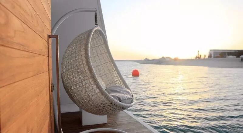 一楼侧边设计成一个露台,一个躺椅允许住客慵懒地享受属于海上的优雅时光。