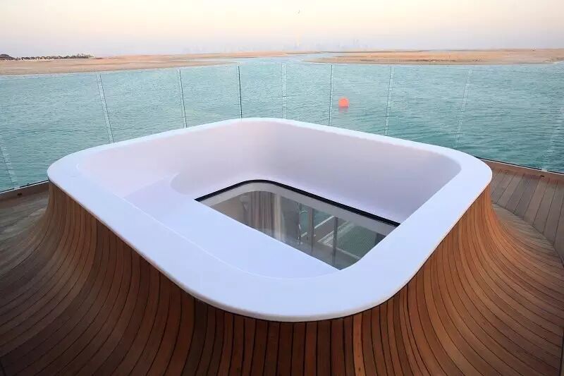 顶层甲板属于娱乐空间,设置了吧台、餐桌、躺椅、还有一个底部透明的按摩浴缸,也就是楼下可以看到楼上人泡澡时的屁股,不得不说这个设计实在污得精妙!总之非常适合派对和休闲用途。如果平时没事的时候,餐吧区域可以将桌椅撤掉,放上床铺,拉起四周的伸缩窗帘,就可以立马改造成一间冬日卧房。
