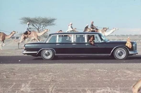 英国女王伊丽莎白二世1979年出访阿联酋时的官方交通工具是一辆奔驰。保护她的警卫骑在骆驼上跟在汽车后面。(这辆车现在在阿布扎比的阿联酋国家汽车博物馆里)