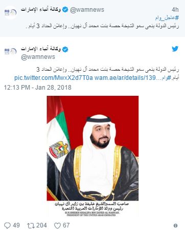 阿联酋总统谢赫·哈利法·本·扎耶德·阿勒纳哈扬殿下的母亲于本周日逝世。总统府发表声明,宣布了这一悲痛的消息。 为表达全国各对阿联酋总统母亲与世长辞的深切哀悼。从2018年1月28日星期日起,全国上下开始为期3天的哀悼。 在此期间,所有收音机全部奏哀乐、冲沙营地暂不营业、一切娱乐演出活动暂停。 本文源自khaleejtimes