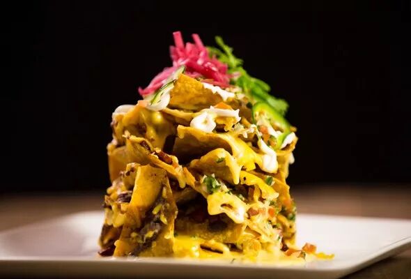 餐厅的餐单有各种佳肴,如满满的桶装玉米片、熏制的牛腩、红糖烧烤酱和超级奶酪、还有Fieri的招牌大餐:培根苹果芝士汉堡,脆皮鸡肉三明治和西南龙虾卷。