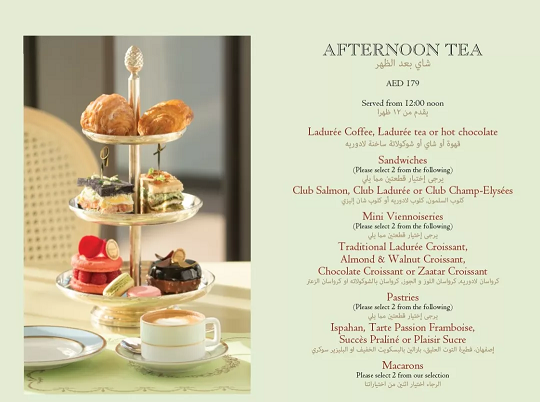 Laduree的下午茶套餐定价179迪拉姆双人,所含的内容非常丰富,包含2个马卡龙、2个三明治、2个吐司面包、2块甜品和一壶茶,基本可以饱腹,度过一个完整的下午,个人觉得性价比还是不错的。当然如果觉得太多或另有组合计划,以上套餐的单品也都可以单点。