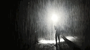 “雨屋”只是一个如仓库一般大的小黑屋,神奇之处是这里正在下雨。一处强光从远处袭来,让整个场景犹如电影般地魔幻。