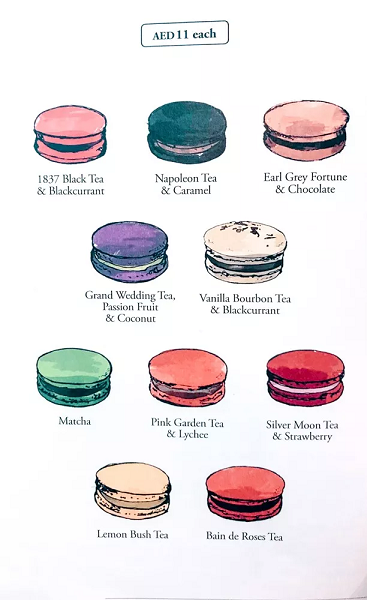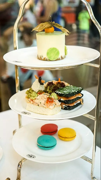 TWG提供5个价位的下午茶套餐,从人均70迪拉姆到人均145迪拉姆不等,走的是英式下午茶的风格。基本是包括一壶茶(热茶或冷泡茶)、一份英式小茶点(经典款是司康),这是最基本款的下午茶了。再往上可以增加甜点的种类并且加入咸口的小食(如迷你三明治或者迷你汉堡)。如果你有选择困难,也可以直接点选TWG为您搭配的下午茶套餐。