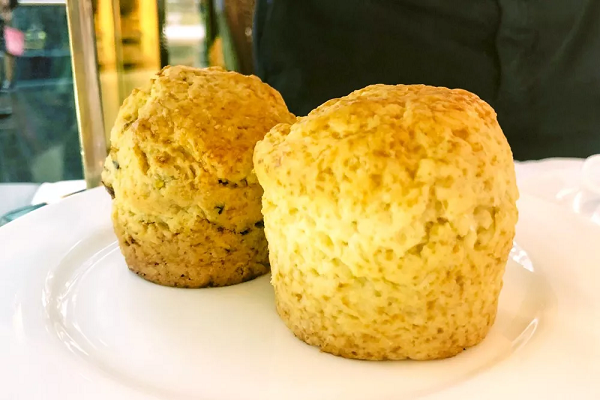 这道组合是我的五星推荐。英式下午茶最基本的配备是司康(Scone),而司康如果做的不好,口感是很渣的,一入口就在嘴巴里面散掉,那就没意思了。TWG的司康端上来的时候是温热的,吃起来口感更松软,不会像是掰一块干掉的馍馍。正宗的吃法是,挖一勺鲜奶油放在自己的盘子里面,再挖一勺果酱在盘子里,然后掰一小块司康,在司康上先抹上鲜奶油,再抹上一层果酱。