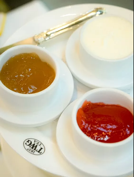 然而重点来了!TWG并没有使用果酱,因为觉得果酱太甜,不够健康,于是TWG自创了果味茶冻来配司康,这是颠覆性的创意。所谓果味茶冻,就是用新鲜的水果,茶水做成的类似果冻口感的冻体,TWG提供草莓和桃子两种口味,搭配在一起凉凉的十分清爽,淡淡的香味在口中弥漫,且完全不会给人甜腻的感觉。如果只能推荐一道茶点给大家,我必然选这道。