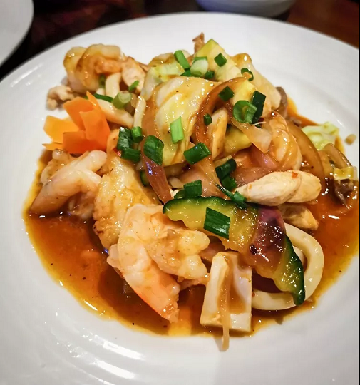 虽然中餐是印巴人做的,但泰餐真的是泰国人在给你炒。牛肉鸡肉还有虾、鱼和鱿鱼圈,食材都很新鲜,搭配的酱汁浓郁鲜美,配菜也丰富,而且泰国师傅的火候也控制的很好,完全没有炒老,味道也可圈可点。