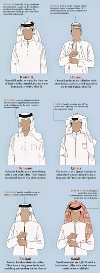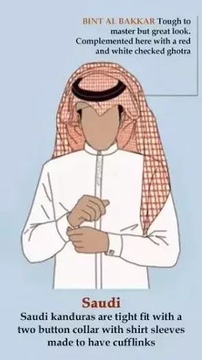 沙特人的服饰通常非常合身,衣领上有两个纽扣,衬衫袖子上也有袖扣。