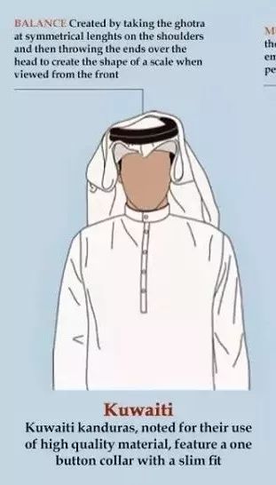 科威特人的穿着以其高品质的面料而闻名,毕竟科威特也是非常富有的石油大国。通常科威特人的着装会是一件合身的、质地上乘的、仅有一排纽扣的衣服。