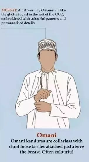 阿曼人的服装通常是无领的,胸部上方有短而松散的流苏,阿曼人最有代表性的配饰是帽子,海湾地区只有阿曼人用帽子代替头巾。