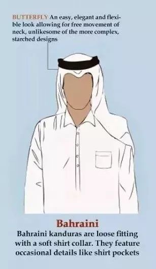 巴林人通常爱穿柔软的衬衫,有衣领,显得较为宽松,也有一些细节设计,如衬衫口袋。