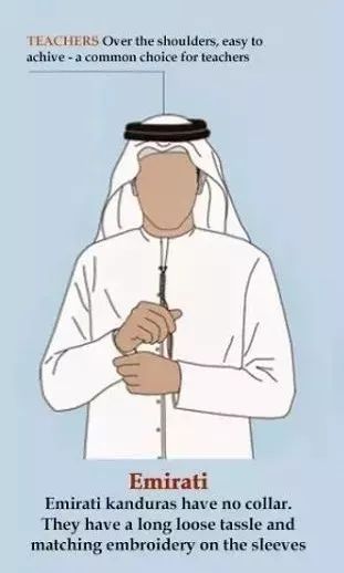 阿联酋人的衣服通常没有衣领,衣服上有一根长长的松散的流苏,袖子上经常绣着与之相配的刺绣。