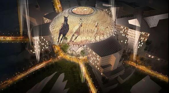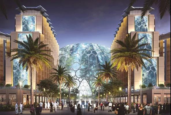会场中心将是Al Wasl广场,沿着广场你会看到餐馆、喷泉和公园。会场顶部是一个65米高,150米宽的圆顶。只需轻轻一按,这个巨大的圆顶就会变成一个巨大的屏幕,在半透明的屏幕上可以看到穹顶的内外。